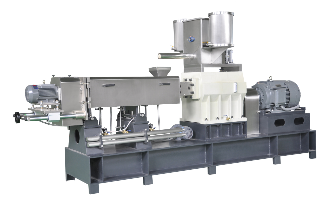 2、雙螺桿膨化機:混合的原料在高溫高壓環(huán)境及雙螺桿的擠壓情況下,原材料中的淀粉結構發(fā)生變化,變成容易吸收的營養(yǎng)成分,通過模具擠出。雙螺桿膨化機采用先進的變頻調速技術,更節(jié)能,速度控制更精確,電機運行中電流、轉速都可以通過變頻器面板直接觀看,確保設備安全。