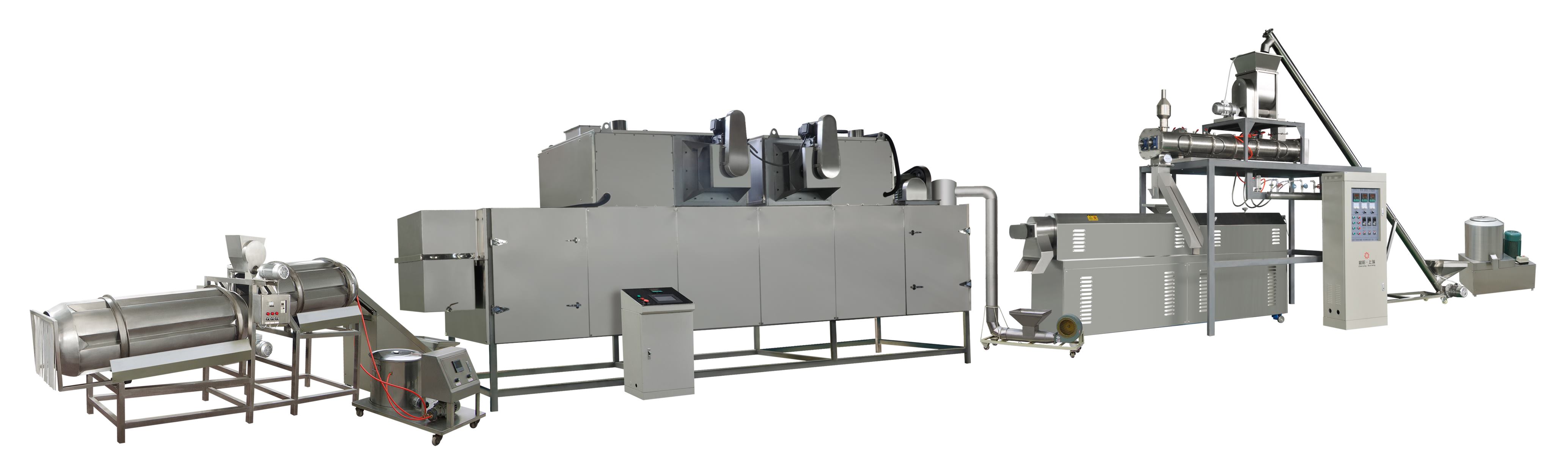 3.膨化烘干工段。大多采用目前先進(jìn)的雙螺桿寵物食品膨化機(jī),配置節(jié)能高效烘干機(jī),膨化效果好,烘干省氣,成本低。