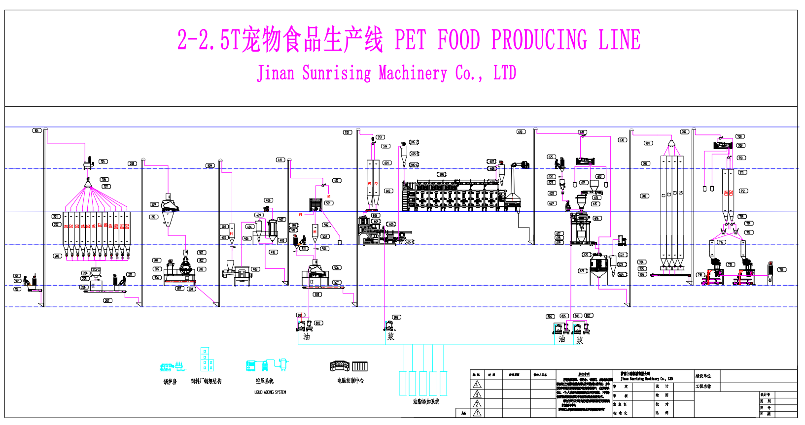 本套2-2.5T/h寵物食品生產線工藝特點,因客戶是空地建設,我司設計首先考慮工藝流程的順暢,在設計上人性化布局,采用4層鋼結構設計,車間建設高度19米(因客戶政府高度限制),工藝方面使用國內主流二次混合,二次粉碎、雙螺桿膨化機、真空噴涂、逆流冷卻,產品混色,包裝碼垛等全部自動流水線。配料倉采用12倉,滿足多種配方配料要求,配料軟件采用布勒系統。配料穩(wěn)定,可儲存多種配方,配料記錄可留檔查詢,原料混合使用雙軸漿葉混合機,混合均勻度≥98%,雙軸混合機排料殘留低,可保證每批原料的混合均勻度一致,粉碎機工藝采用粗粉加細粉,批次粉碎。避免不同原料進粉碎機因過篩問題產生沉降層。粗粉碎使用臥室錘片粉碎機,粉碎細度20目,產量高。細粉使用超威粉碎機,刀頭使用鎢合碳化鋼,硬度高。粉碎細度80目過篩率95%。保證產品成型表面光滑,無凹凸顆粒狀。在二次混合添加微量元素和一定比例油脂,提高產品油脂含量。膨化機使用雙螺桿膨化機,產品穩(wěn)定,烘干使用帶式低溫干燥,微量元素熱損低,噴涂使用真空噴涂,油脂添加30%。使用翻板逆流冷卻器,冷卻效果好,配置4倉暫存?zhèn)},可以存儲4種不同顏色的產品,每個倉存儲可以到6個小時膨化產能的產品??梢酝瑫r四個顏色進行混合,包裝方面配置自動打包稱,自動碼垛機,給帶式包裝機,包裝規(guī)格500g-25kg全部實現。