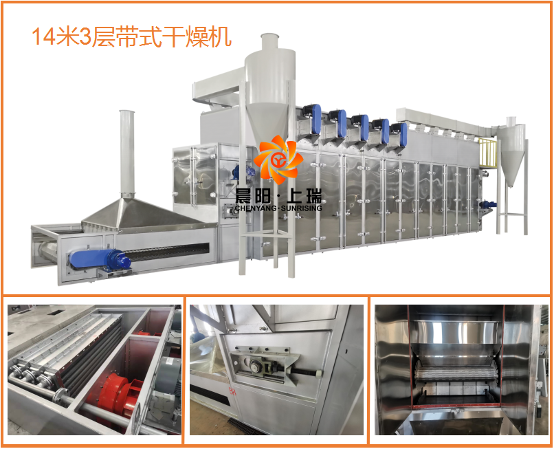 干燥方面,客戶技術指標,成品大于2H/h,脫水率:32%降至5%以內,對脫水干燥能力具有較高的要求, 晨陽干燥機本次配置14米3層干燥機,帶寬2米,箱室高度達2.4米,通風對流效果好,中間段12米,2米一節(jié)。使用不銹鋼鏈板網帶,使用壽命長,鏈板基本上沒有維修率,鏈板沖孔方式使用晨陽設計的新技術,透風性好,支撐能力強,托料能力強。一平方承載22.5-35公斤物料。3層鏈板獨立變頻調速,烘干停留時間30-90分鐘。2段控溫,自動比例調節(jié)閥。蒸汽加熱,使用碳鋼無縫管鋁翅片,散熱好,能源利用高,獨立變頻的排濕系統,濕度數顯,數據化操作。出料端設計3米強制冷卻段,迅速降低顆粒表面溫度。確保在后端噴涂前工藝緩沖倉不會因溫度過高產生熱汽結團