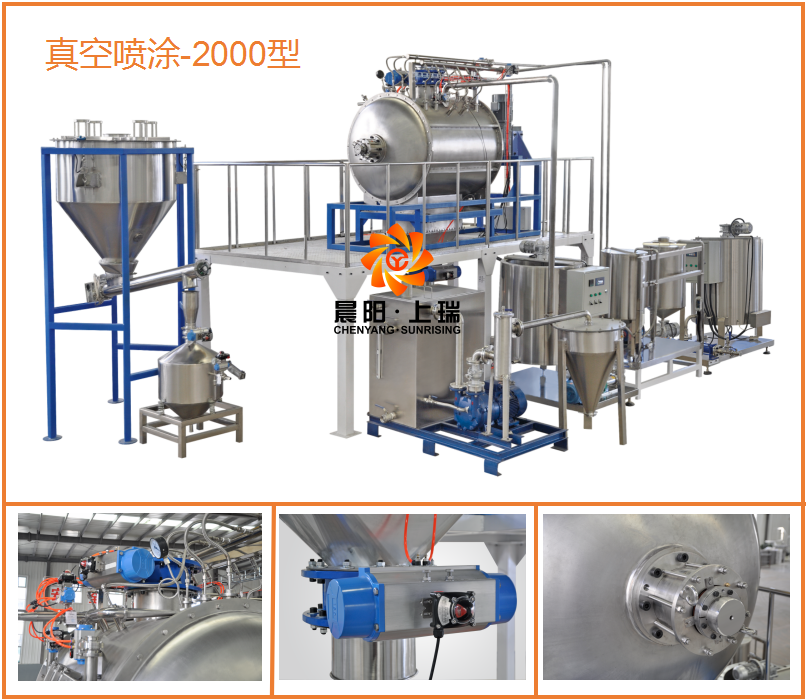 真空噴涂使用晨陽自行研發(fā)的第三代真空噴涂機,該真空噴涂系統目前使用臥式單軸漿葉混合機,該機比較適合2噸生產線的產品配置使用,具有高性價比的使用效果。密封閥門使用進口配置,機械密封使用合資配置,減速機使用硬齒面減速機,食品接觸完全304材質。真空狀態(tài)下噴涂油脂含量可以到30%,真空壓力達0.095mpa,動態(tài)狀態(tài)下保壓0.09mpa堅持10分鐘在以上。配置水冷真空泵。油脂,風味劑都是在真空狀態(tài)下完成,油脂獨立稱重系統,膏狀風味劑,獨立稱重系統,不同液態(tài)使用不同的輸送泵,晨陽公司自行編輯的運行軟件在第三代真空噴涂已經實現完全自動化,穩(wěn)定化,參數可視化,重要部位數據監(jiān)視報警,數據存儲,配方留檔等強大功能。